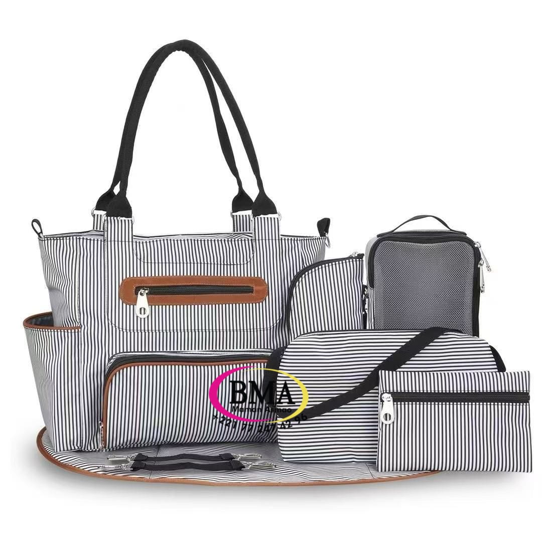 Ensemble sac à langer multifonctionnel de 7 pièces, arborant un motif à rayures verticales noires et blanches avec des accents marron/tan. Conçu pour l’organisation et le transport des essentiels de bébé, l’ensemble comprend un grand sac fourre-tout, un petit sac à bandoulière, un sac isotherme, un tapis à langer portable et d’autres accessoires assortis.