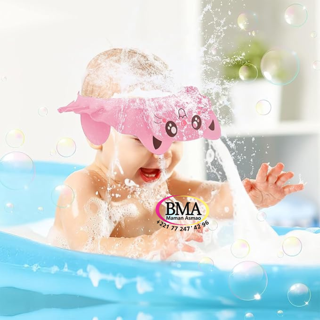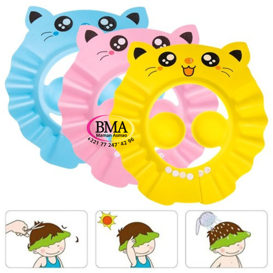 Chapeau de bain pour bébé en forme de chat, disponible en rose, jaune et bleu. Elle protège les yeux et les oreilles de l’enfant pendant le lavage des cheveux, pour un moment de bain sûr et agréable. 🧼💦