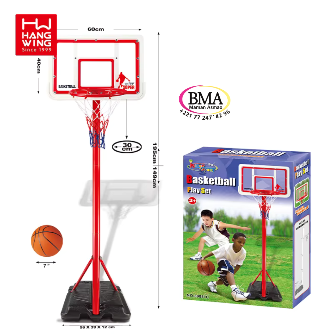- Contenu : L’ensemble comprend un panneau, un panier avec filet, un poteau en métal, une base, un ballon gonflable et une pompe.